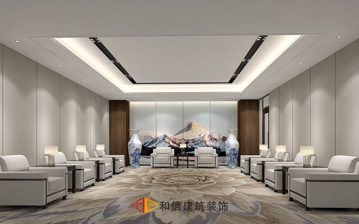 接待區(qū)整個空間講究左右對稱,主要以白色為主,整個空間為環(huán)形設(shè)計,方便了大家面對面交流,地面的立體大花和背景的中國山脈裝飾畫相輔相成,形成了獨特的新中式風(fēng)格,給人帶來全新的視覺體驗,呈現(xiàn)不一樣的接待氛圍,有一種氣勢宏偉的感覺。給到訪的賓客有溫文儒雅、富而好禮的尊貴感受。
