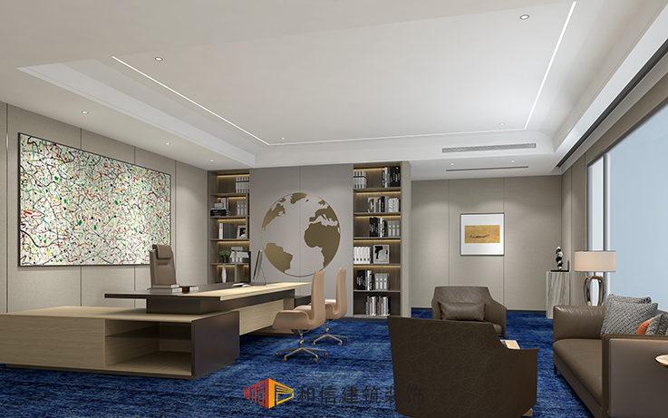 總經(jīng)理辦公室的裝修設(shè)計,直接代表著企業(yè)的形象和實力,案例中展示的總裁辦公室為新中式風(fēng)格,總裁辦公室既有辦公區(qū)也有接待區(qū),方便了總裁接待客戶,背景墻的裝飾畫和簡約鏤空的世界地圖,給人眼前一亮的視覺沖擊,整排多元收納柜,可以收納不同規(guī)格的商務(wù)文件。