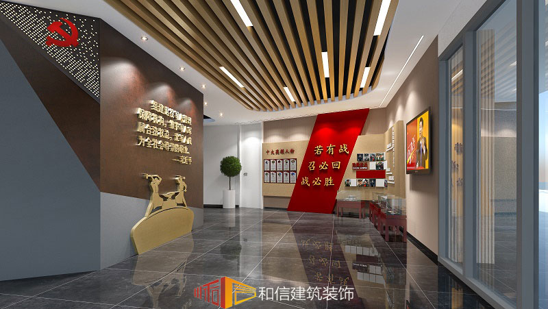 走進(jìn)黨群宣傳過道,引入眼簾的是兩側(cè)墻面的宣傳牌,展示的內(nèi)容是歷經(jīng)歷史文化底蘊(yùn),黃、棕、紅的經(jīng)典搭配,原木與大理石碰撞,配以燈光氛圍,營造出濃厚的文化歷史底蘊(yùn),同時(shí)也豐富了空間的層次感。