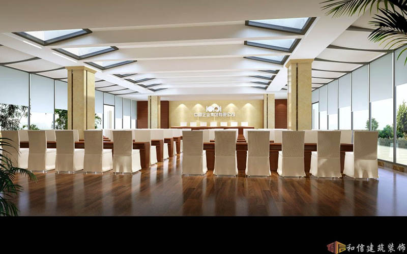 會(huì)議室整體的設(shè)計(jì)風(fēng)格為傳統(tǒng)的中式風(fēng)格,擺放整齊地桌凳配上頂部設(shè)計(jì),整體不失嚴(yán)肅,背景墻上圖片以及裝飾的設(shè)計(jì),達(dá)到好話氛圍的效果。